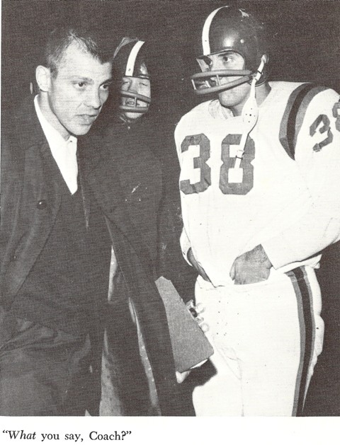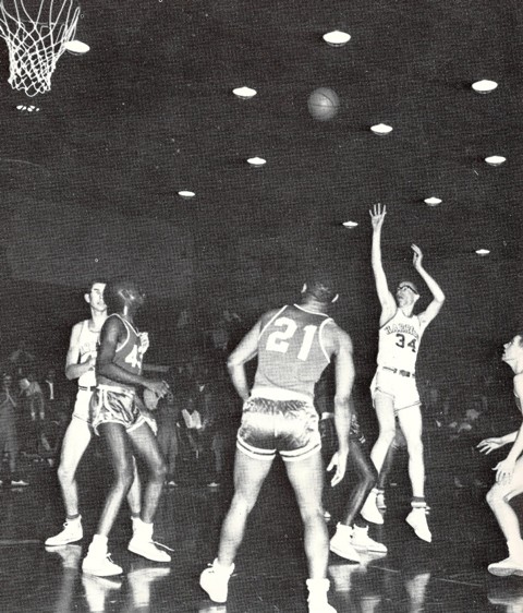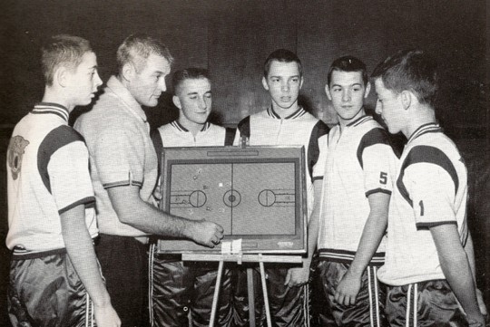 Larry Steinfort, Bill Hines, Gary Pursifull, Phil Crouch & Bob Ennis listen attentively as basketball coach, Mr. Revis carefully explains and demonstrates a play.