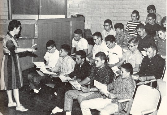 Miss Grabill, vocal music teacher, directs the Boys' Glee Club.