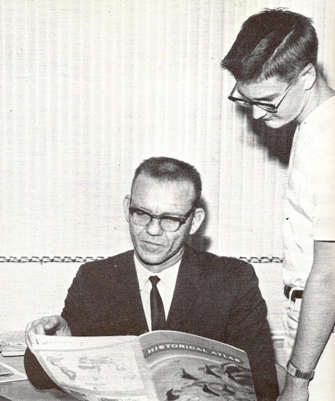 World History teacher, Mr. Rae, helping student Lynn Jefferies.
