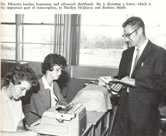 Marilyn McQueen, JoAnn Hartman, Barbara Smith & Karen Slayback read along and practice writing shorthand as Mr. Pikoraitus guides them in the skill.