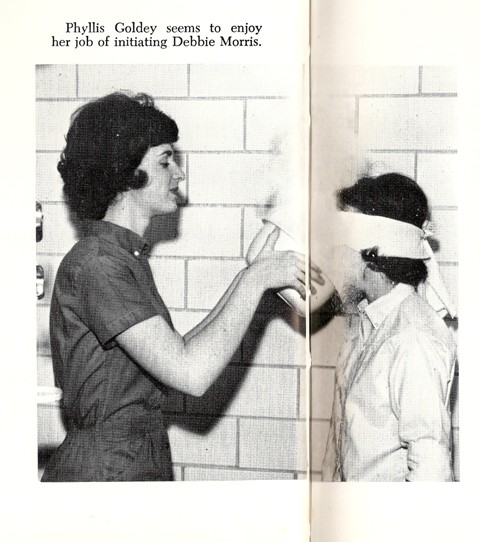 The initiating of new members to G.A.A. is an enjoyable privilege for senior members. The unsuspecting girls are run through a gantlet of hideous tortures, such as Karo and Wheaties. Sue Jaisle and Virginia Stindt encourage a reluctant freshman, Jo Jean Jackson.